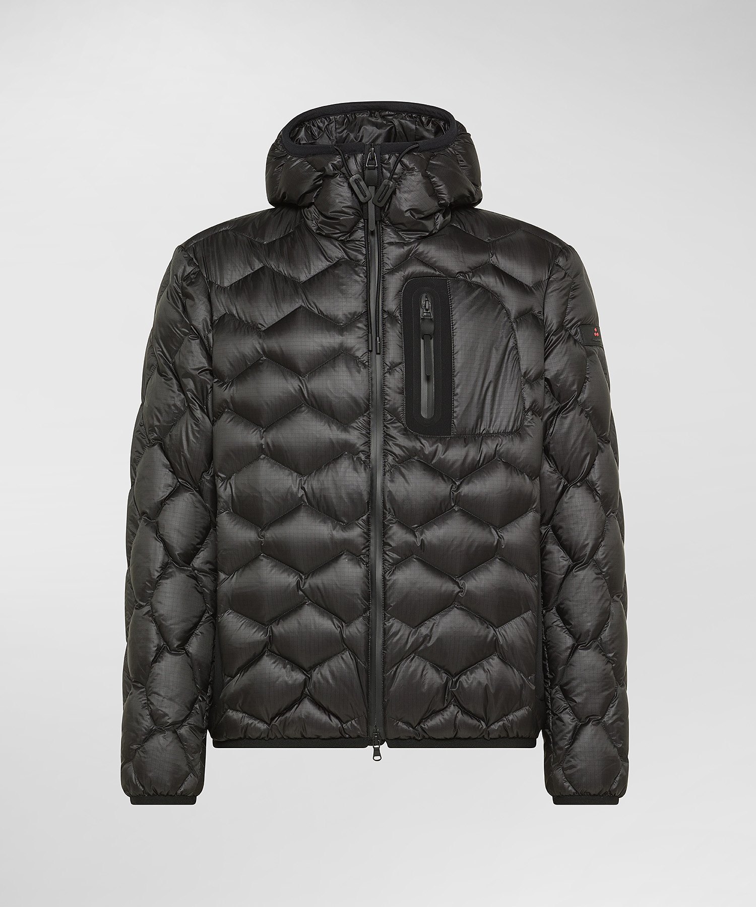 Gewatteerd donsjack Van Peuterey, gemaakt van een ultrafijne en scheurbestendige, glanzende stof – en van stretchnylon gecombineerd met een zachte en warme nylon jersey, verkregen uit fijne garens. Zijzakken met rits en een thermisch gesealde borstzak maken dit kledingstuk technischer. De thermisch gesealde ritsen zijn ontworpen om water- en winddicht te zijn, vocht en lucht te weren en te beschermen tegen kou en weer. Zwarte, doorlopende, centrale, spiraalvormige, omgekeerde rits, ritstrekkers op de zakken en details op de manchetten en capuchon benadrukken het sportieve karakter van het kledingstuk. Regular fit.